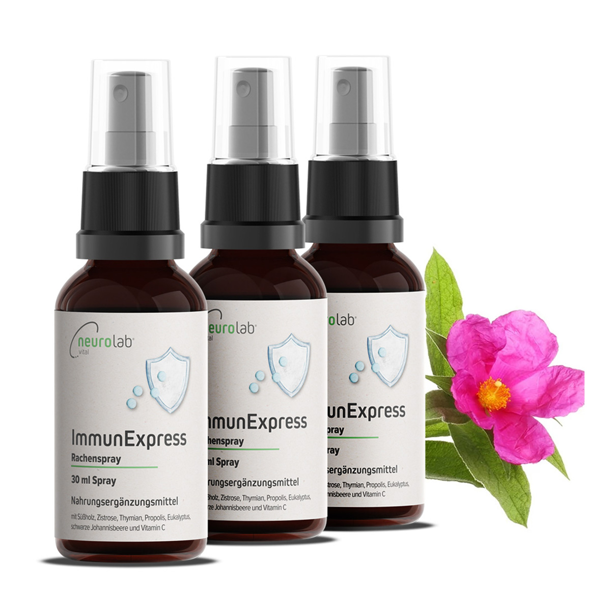 Die Rezeptur von ImmunExpress enthält die wertvollen Zutaten Zistrose, Süßholz, Thymian, Propolis, Eukalyptus und schwarze Johannisbeere. Mit Vitamin C wird dein Immunsystem* besonders unterstützt* und du kannst dich bestens gewappnet fühlen!